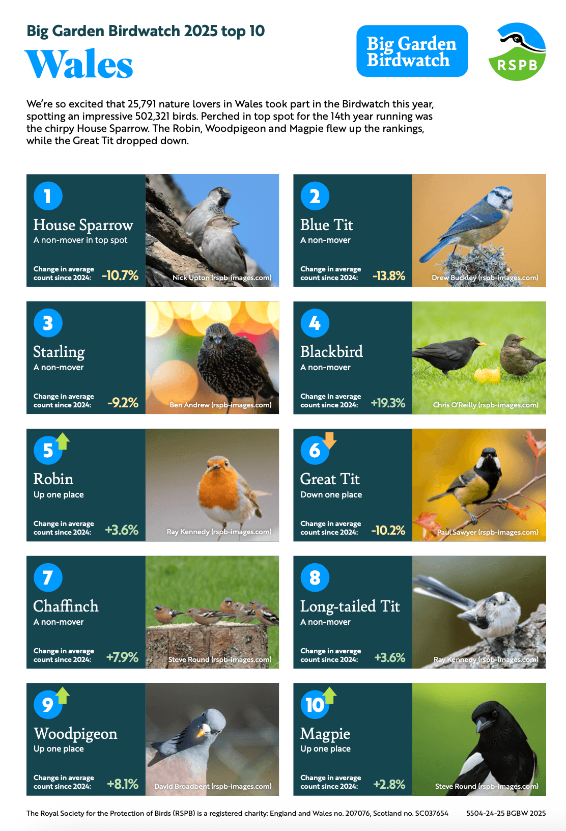 Across the UK, over 590,000 people took part in Big Garden Birdwatch 2025, counting a whopping 9.1 million birds! House Sparrows took the top spot, but counts of these chirpy birds are down by 64% compared to the first Birdwatch in 1979. In fact, we’ve lost 38 million birds from UK skies in the last 60 years. With birds facing so many challenges, it’s more important than ever to get involved in the Birdwatch. Every bird you do – or don’t – count will give us a valuable insight into how garden birds are faring.